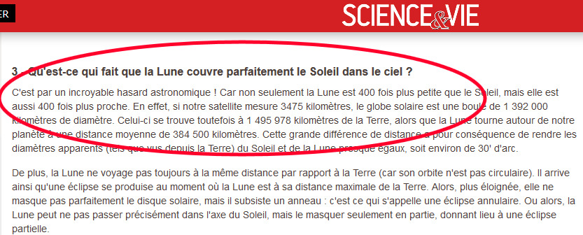 science et vie, vous apprendrez que «ce qui fait [lors des éclipses] que la Lune recouvre parfaitement le Soleil dans le ciel est dû à un