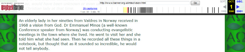 C'est l'histoire d'une dame norvégienne qui, alors âgée de 90 ans, reçut en 1968 une vision des temps de la fin, dont elle confia les détails à un pasteur. Si je vous en parle, c'est parce que cette histoire refait «surface» depuis quelques mois et qu'elle laisse perplexe tant les détails qu'elle fournit sont précis.